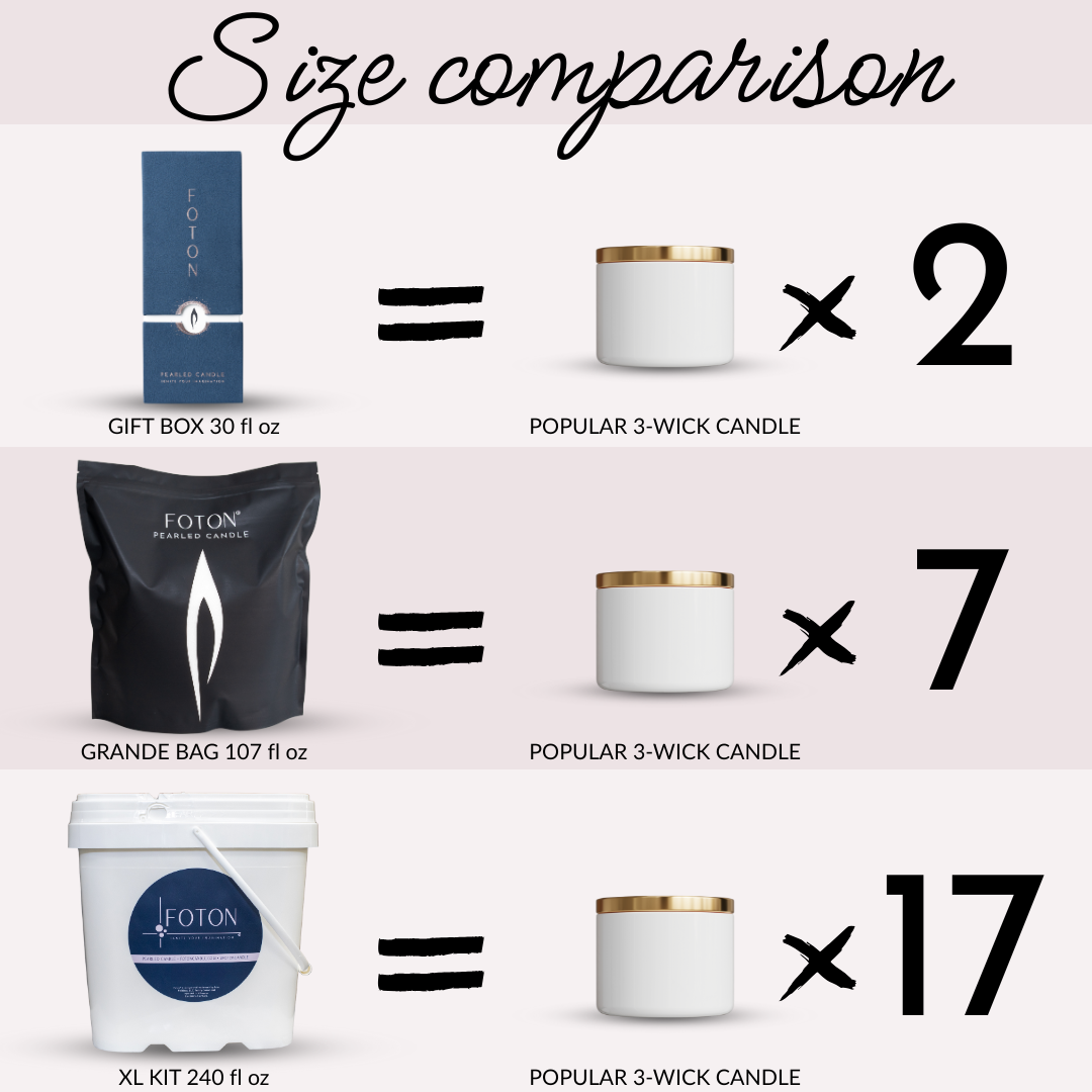 That said, Foton burns slower than normal candles and our 18 oz candle provides up to 120 hours of burn time, longer than most candles. Our 64 oz candle provides up to 400 hours of burn time and 144 oz candle up to 960 hours of burn time.