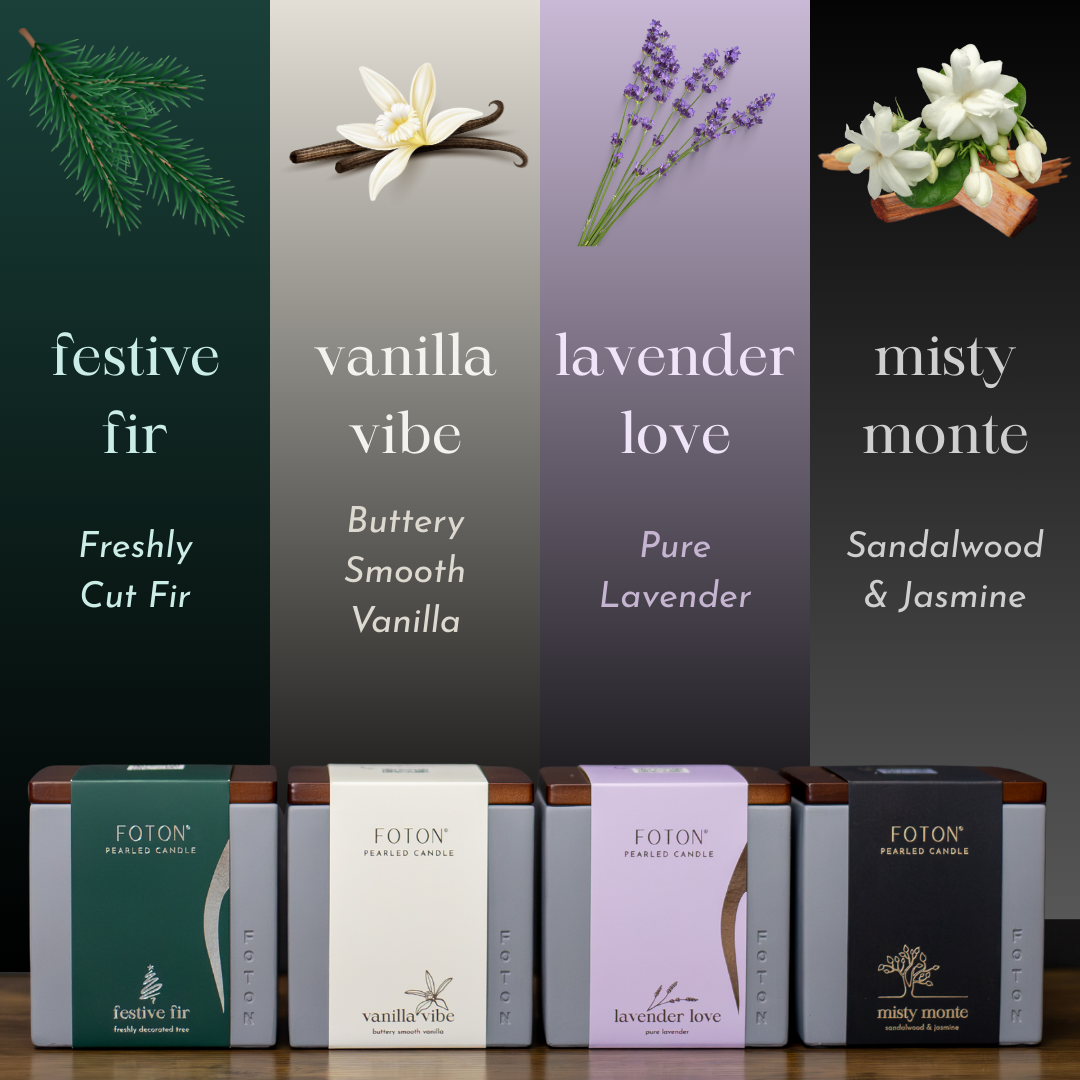 Foton Candle pearls are plant-based, vegan, and burn cleanly with minimal smoke or soot. Our pearls are derived from certified sustainably sourced and highly purified plant-based wax. They do not contain paraffin, soy or any known allergens. We use both natural and synthetic fragrances to scent our scented versions. Our scents are free of phthalates and parabens.